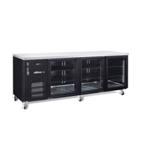 Manufactured in head wearing black coated steel with stainless steel top and interior floor, this glass door unit with LED lighting ensures an attractive display while adjustable shelves enable different sized bottles and cans to be stored efficiently and with maximum impact.