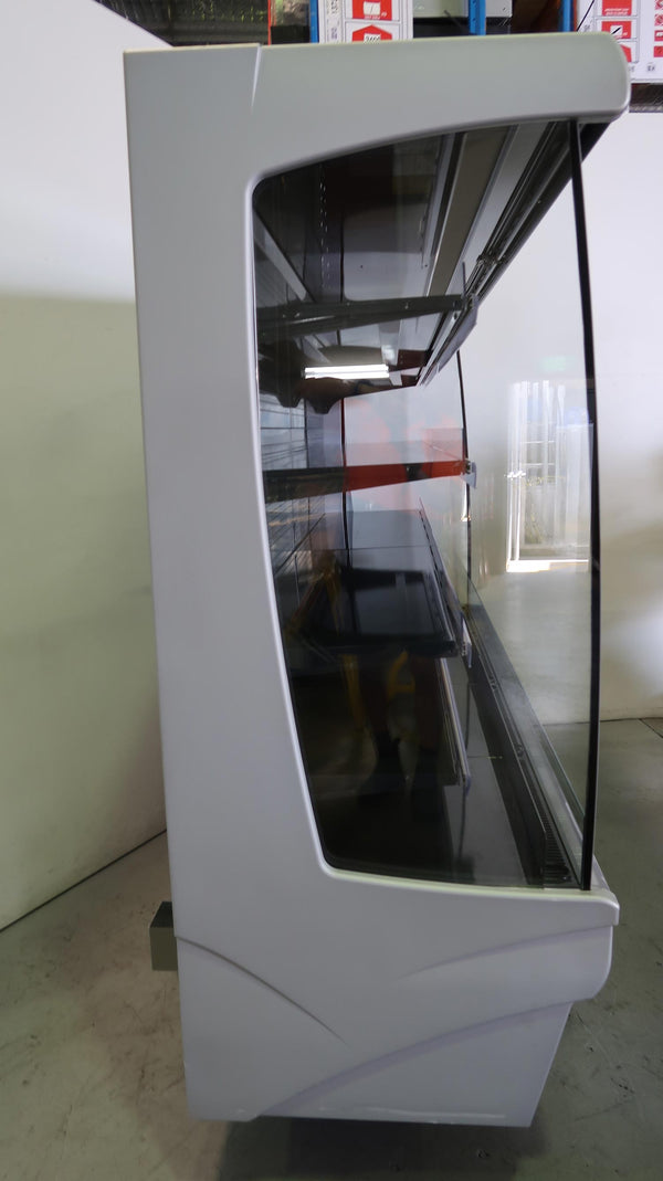 Dairy Reach In Display. Features Range 0-8 C, 4 Shelves, Internal Lighting, Digital Temp Controls, Retractable Curtain, Climate Class Normal, Grey Finish, Scratches, 20 Amp 1 Phase, 2590mmW x 850mmD x 1990mmH, 500KG