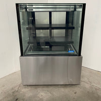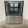 Square Glass Refrigerated Display. Features Square Glass, 2 x Tier, Internal LED Lighting, 2 x Rear Sliding Glass Doors, Digital Temp Controls, On Castors, Climate Class Normal, S/S Finish, Scratches & Dents, 10 Amp 1 Ph, 900mmW x 660mmD x 1200mmH, 200KG
